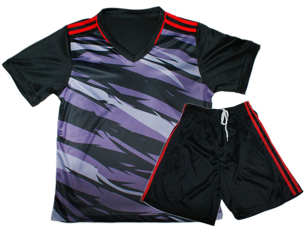 Футбольная форма состоит из классического комплекта, который включает в себя игровую футболку и шорты. Используется как форма для полевых игроков команды. Футболка с коротким рукавом пошита из черного полиэстера с принтом, и V-образным вырезом горловины. На плечах полоски из красного материала, как на шортах. Шорты пошиты из полиэстера черного цвета с тонкими полосками красного цвета. Благодаря свойствам ткани форма не парит кожу, быстро отводит влагу и прекрасно вентилирует. Быстро высыхает, не требует дополнительной глажки.